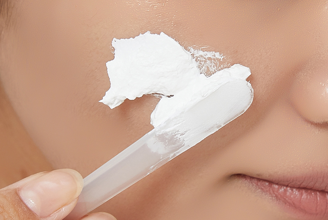 STEP 01 세안 후 내장된 스파튤라를 이용해 피부색이 보이지 않을 정도로 얼굴과 목에 도톰하게 (약 1-2mm 두께로) 바릅니다.